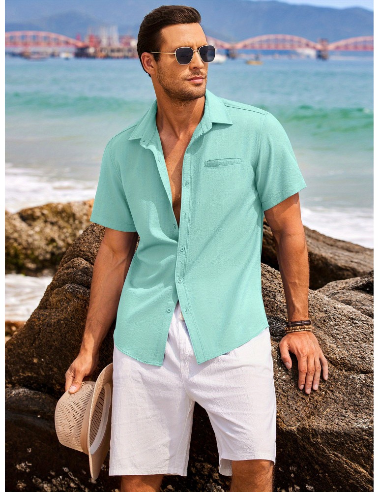 • 1pc Men'S Casual Linen Blend Short Sleeve Shirt - Summer Beach Button Down with Regular Fit, Solid Color, Basic Style, Suitable for All Seasons, Plus Size